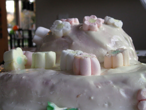 Ja siis ma ei teinud ikkagi pidusaia, sest kallis väänik leidis sellest samast perepidude raamatust mingisuguse kübaratordi, mida oli kindlasti vaja teha. Koogi sisse läks suurt hulk küpsisepudi, hapukoort, vaarikaid (oi, kui mõnus oli oma isiklik külmutatud toormoos lagedale tuua)...aa...pakk võid ka ja veidi suhkrut. Kook oli vaja teha kahes osas, alumine laiem osa ja pealmine - väiksem ja kõrgem osa. Küpsise-hapukoore segu seisis öö läbi vormides. Pärast määrisin veel natuke magusa hapukoorega üle ja panin vahukommid peale, nagu retseptiski oli. Täitsa ilus jäi. Need kaks last, kel oli mahti koogitükk süüa, sõid need ilusti ära. Ehk siis oli hea tort ikkagi..